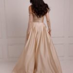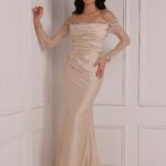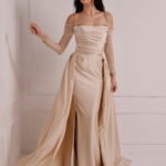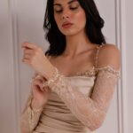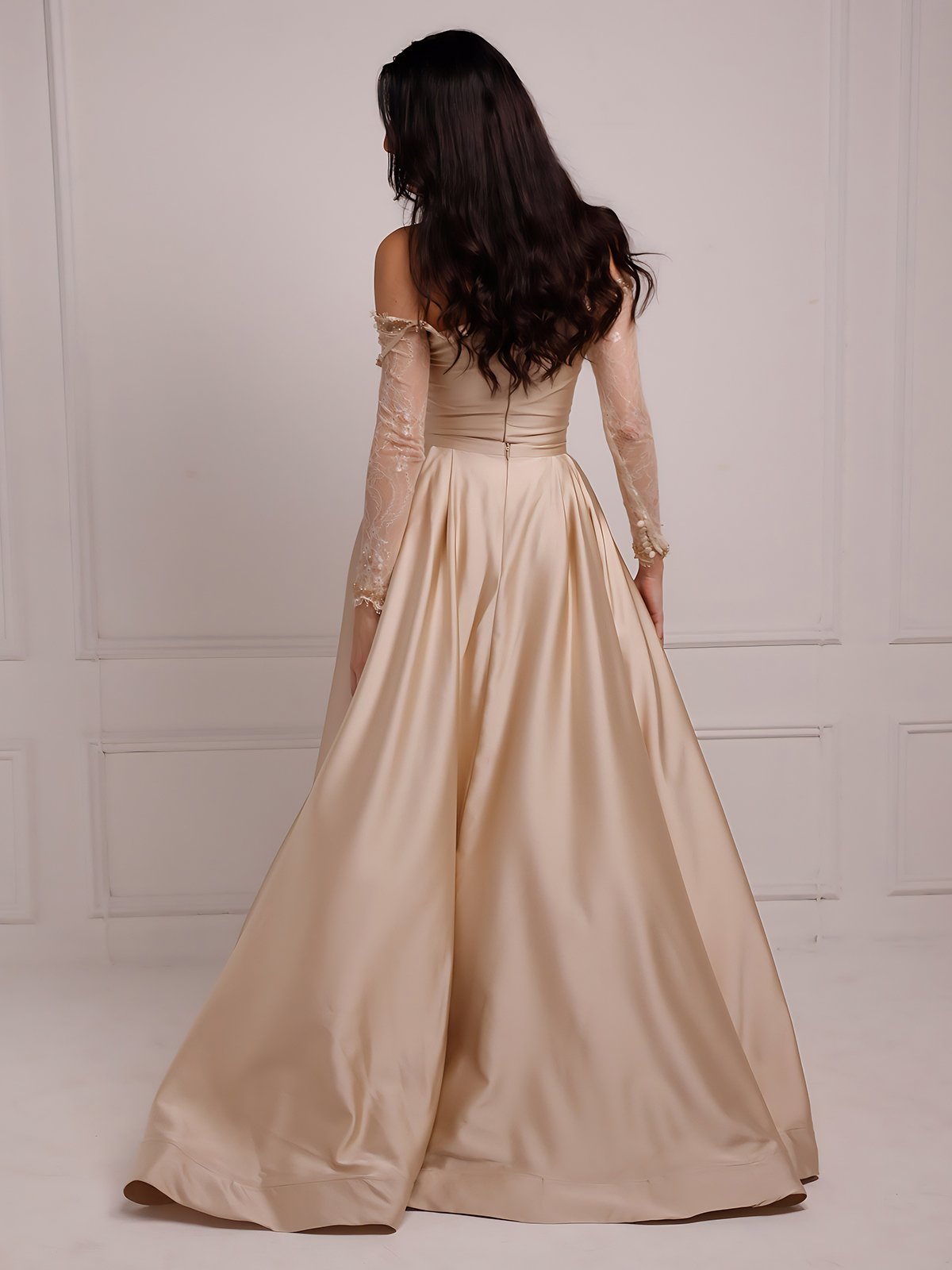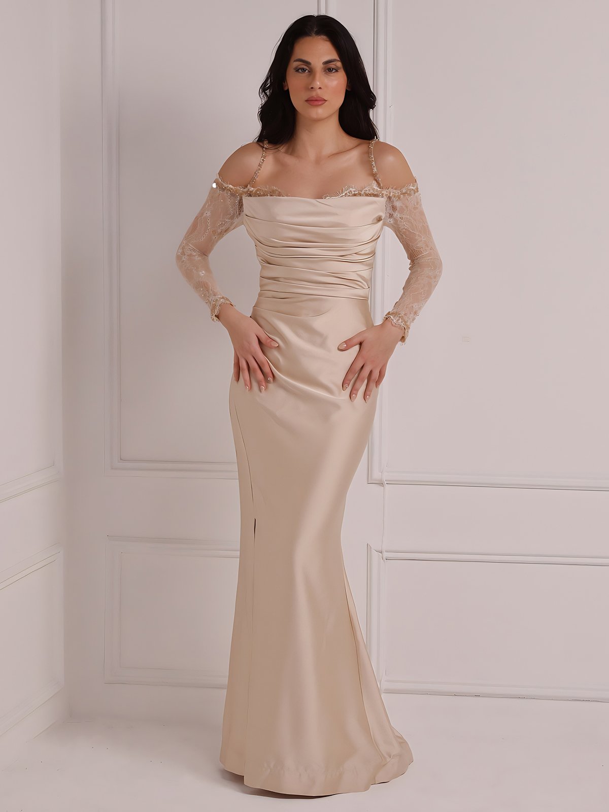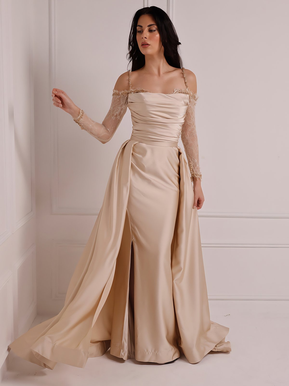A champagne evening down delicate lace sleeves, flowing layers and front slit