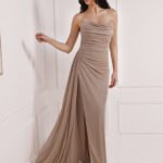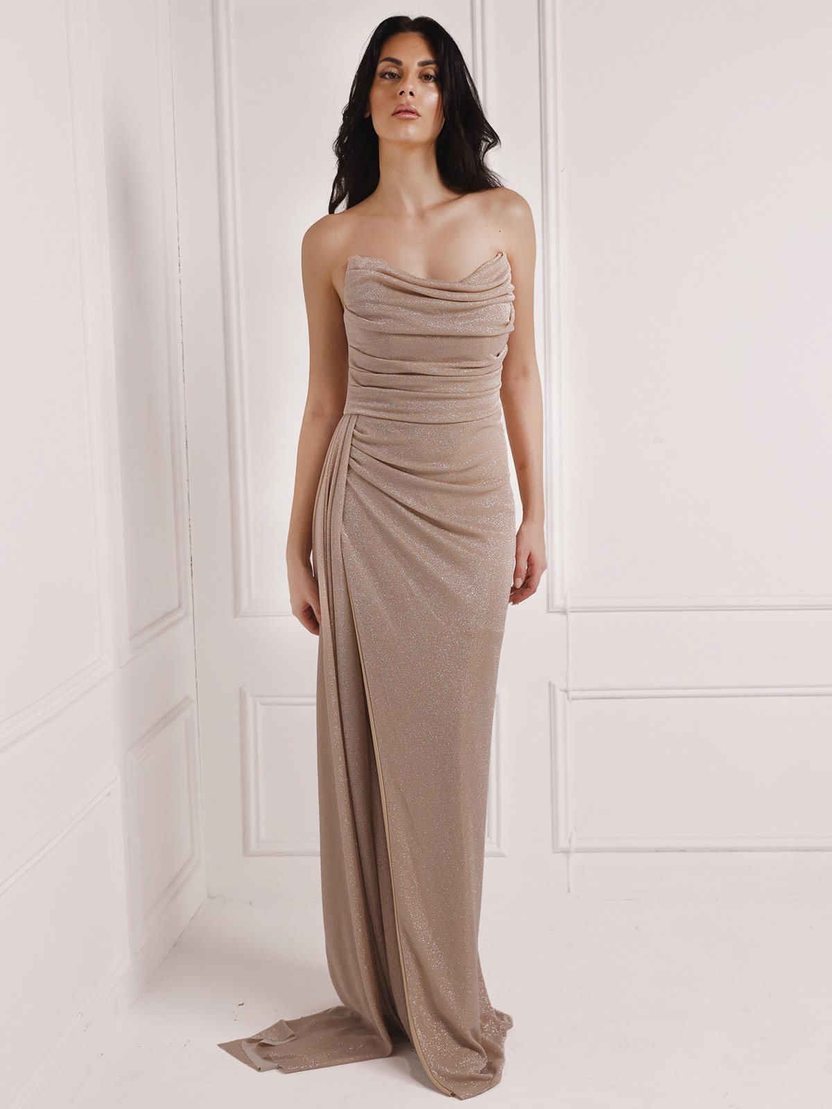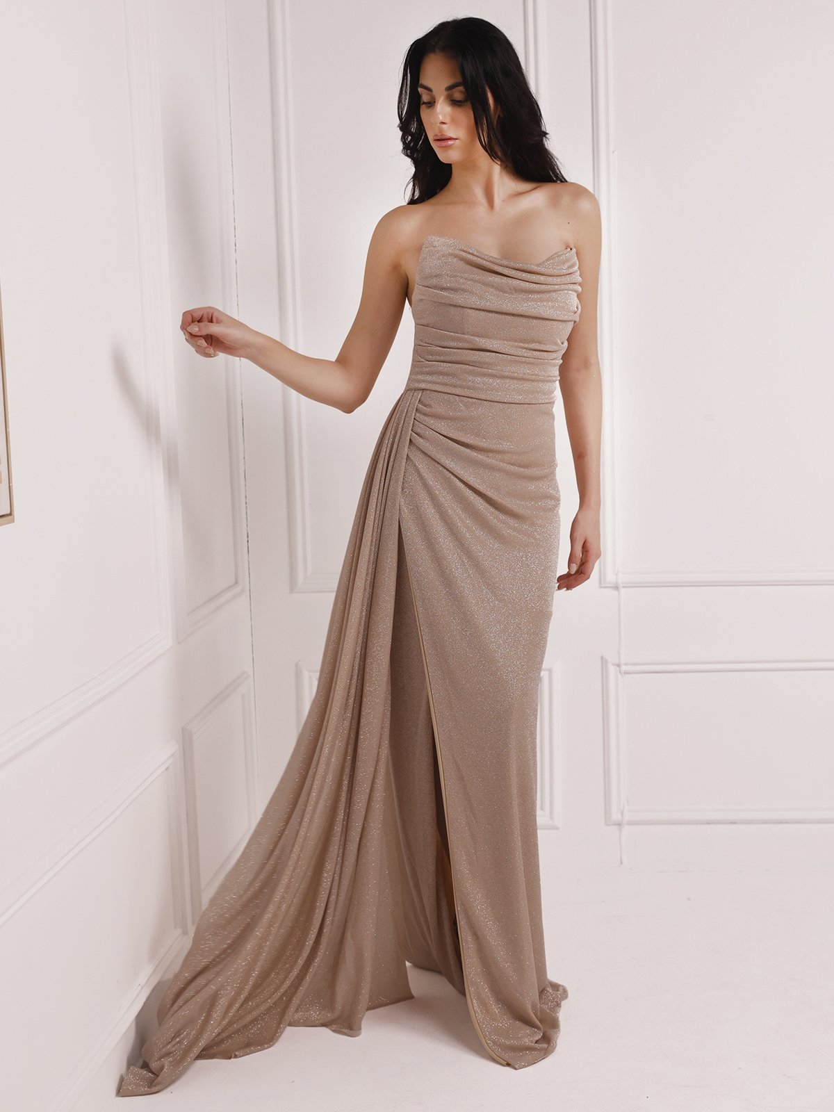 Strapless gown crafted in glittery champagne fabric with a side slit