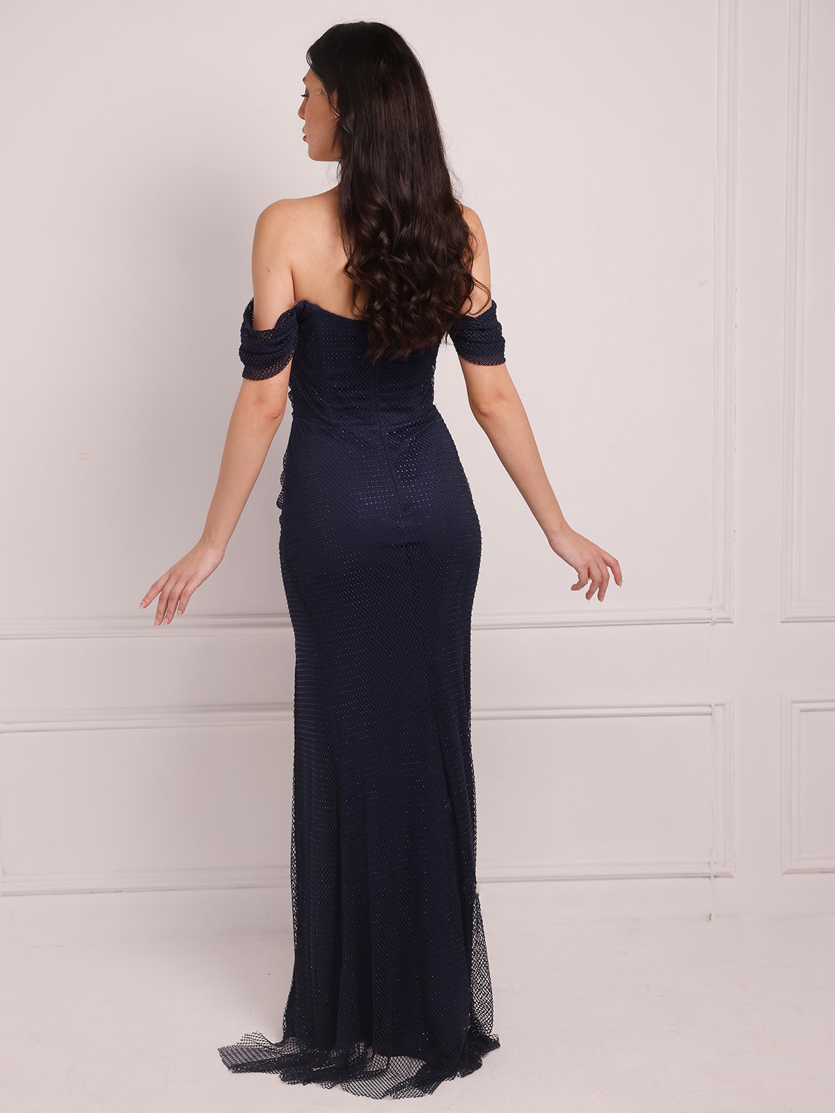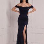 Off-shoulder navy gown adorned with shimmering details, with a high slit