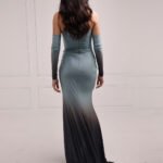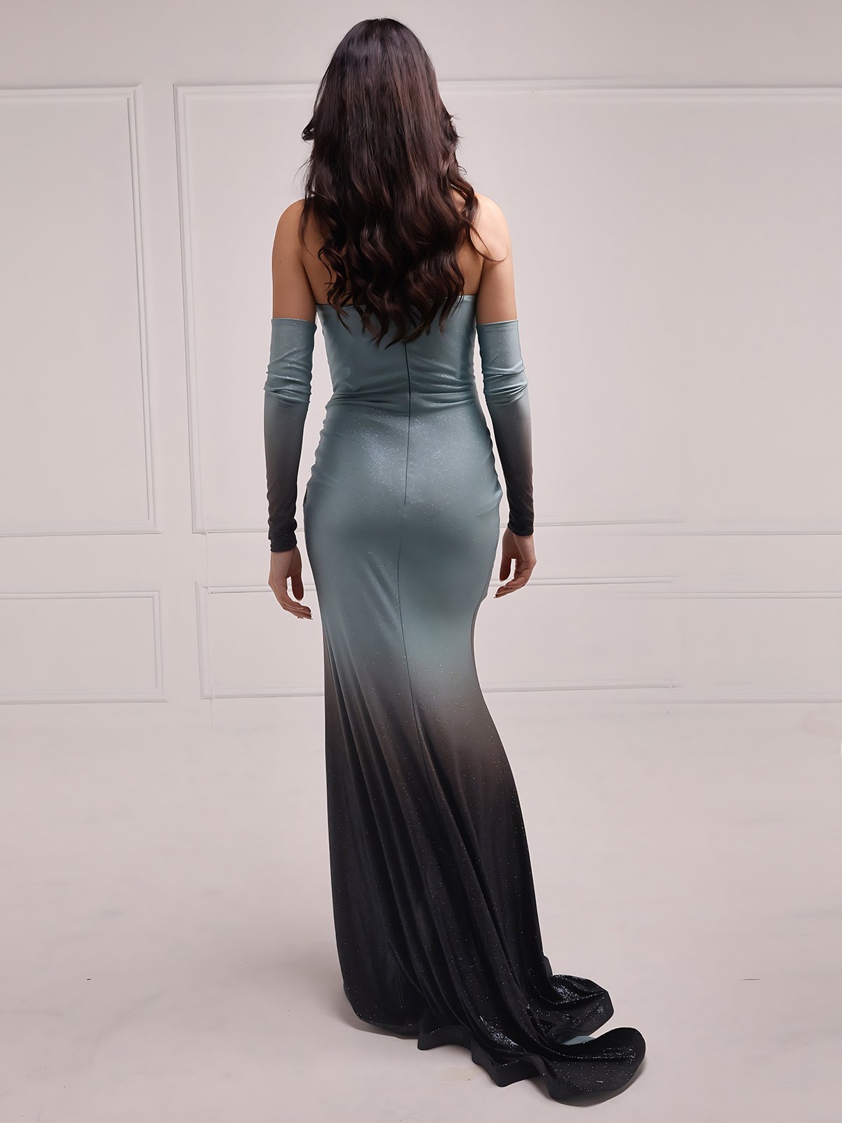 Aqua blue gown, designed with sparklimg ombre details and a graceful side slit with coordinating sleeves